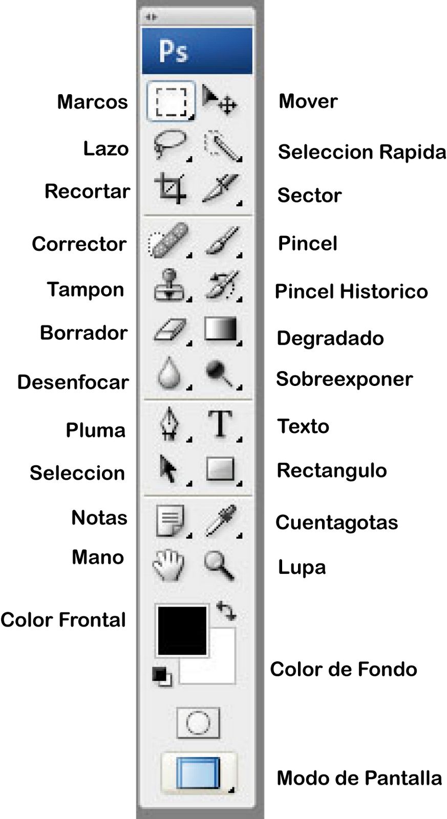 La barra de herramientas de Photoshop aparece normalmente a la izquierda y se puede mover o mostrar desde Ventana > Herramientas. Algunas herramientas tienen opciones ocultas (indicadas con un triángulo) y muestran su nombre al pasar el cursor encima. Desde CC 2015 es posible personalizar la barra.